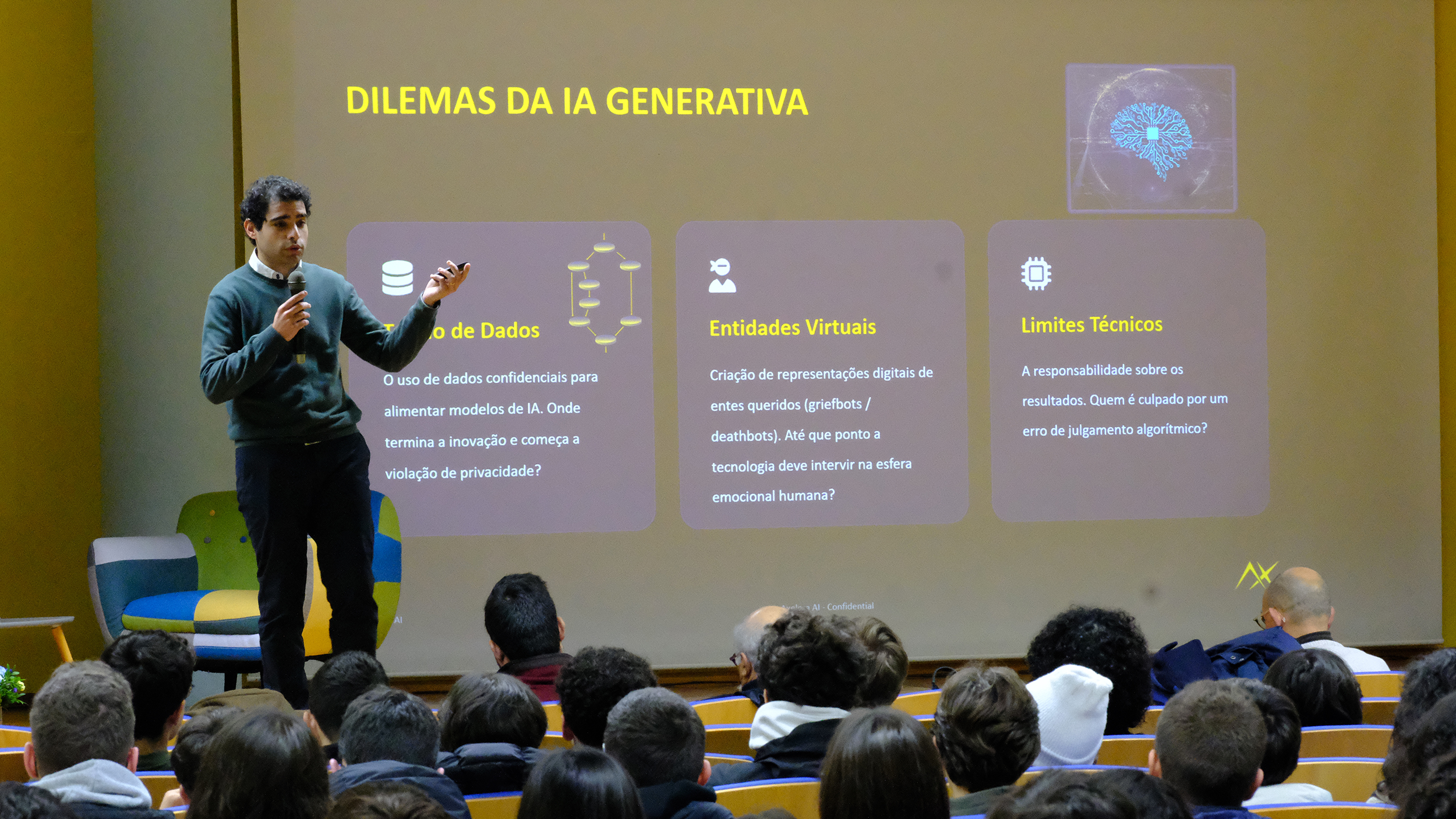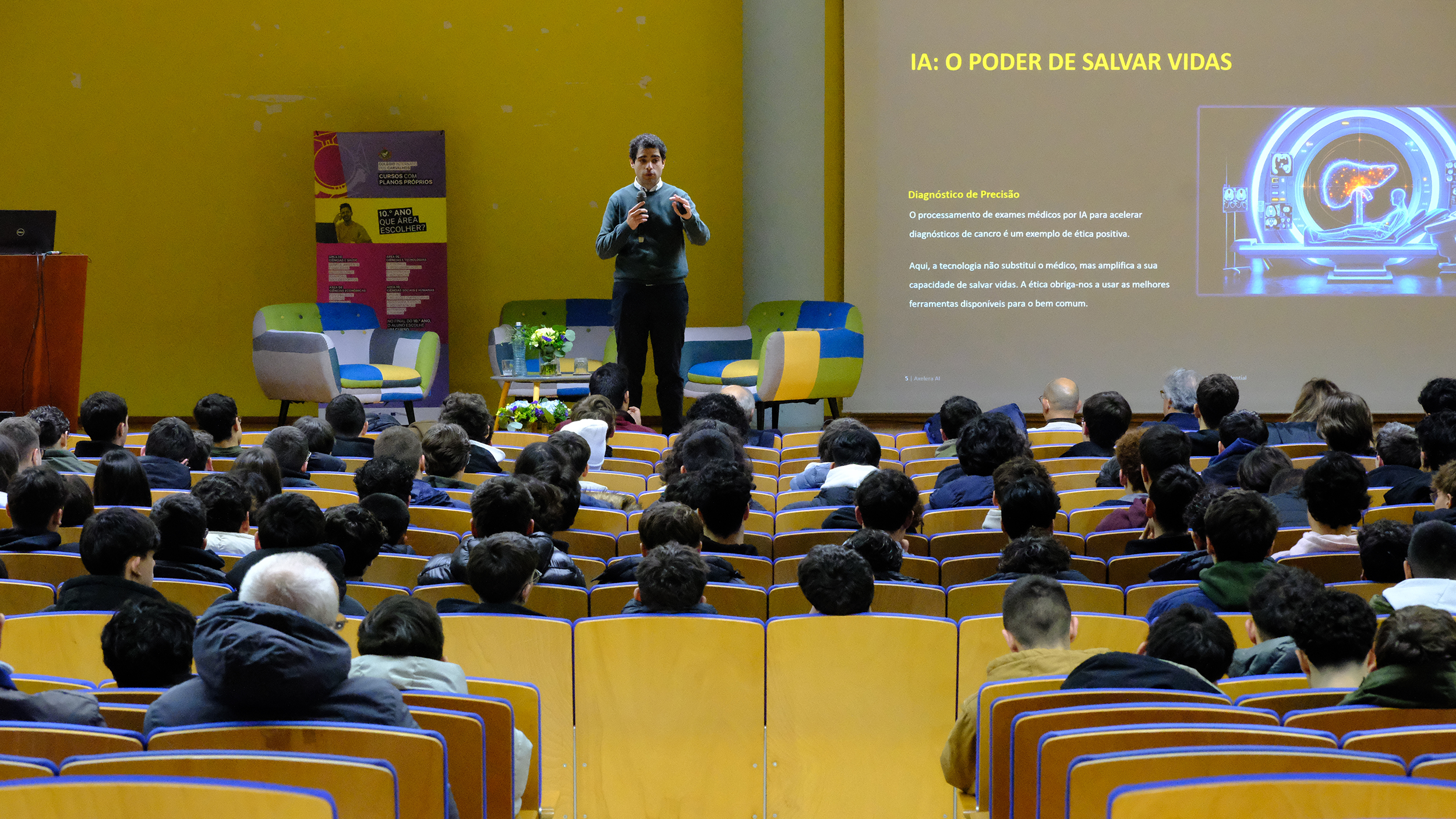 Deste modo, a primeira conferência foi realizada pelo Eng.º Manuel Oliveira, que desenvolve projetos na AXELERA AI. Desde logo, falou da sua ligação ao CIC, já que foi estudante no Colégio. De seguida, apresentou o conceito de Inteligência Artificial e o cuidado que os alunos devem ter para a utilizar da melhor forma. Para além disso, como aspetos negativos, apontou a excessiva dependência que esta pode causar. Como elemento positivo, identificou a agilidade no trabalho. Por fim, enfatizou e dissertou sobre a importância do conceito de Ética no mundo empresarial. Por isso, ao longo da sua apresentação, afirmou que os valores e a palavra do engenheiro são fundamentais para a integridade e a confiança na concretização do projeto. Por último, deixou uma citação que apelou à reflexão dos alunos “A técnica sem ética é perigosa; A ética sem técnica é ineficaz.”