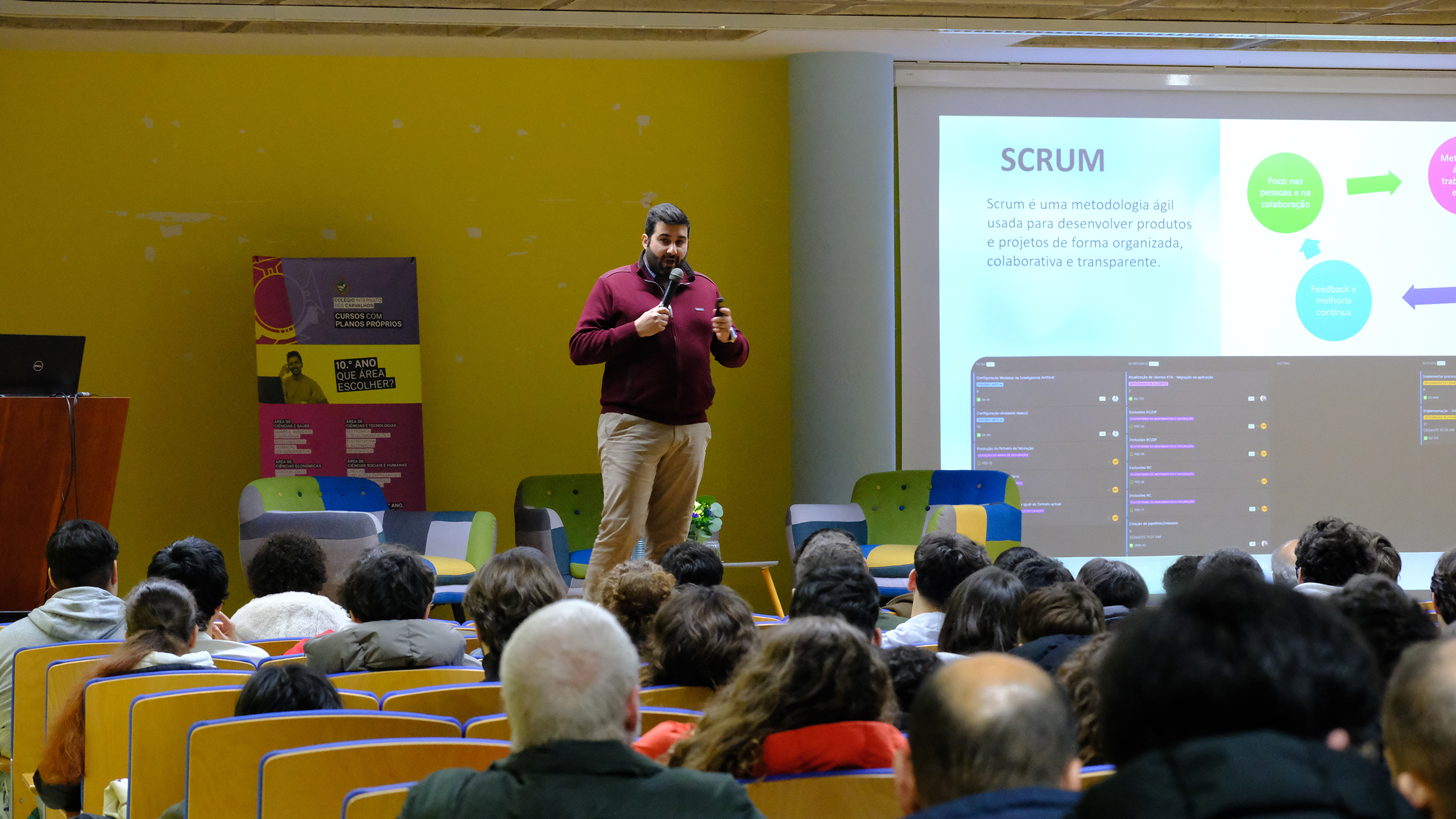 Seguiu-se a intervenção do Eng.º Jesualdo Matos, que trabalha na empresa MDS-Group. Logo após uma breve apresentação da empresa, começou por falar da sua experiência profissional. Descreveu um pouco do trabalho que realiza enquanto engenheiro informático. Por isso, alertou os alunos para a importância do trabalho colaborativo e a necessidade de um constante “feedback” entre todos os colaboradores. Relativamente a questões éticas, valorizou a necessidade de todos terem consciência do desenvolvimento que a IA tem no ambiente empresarial. Afirmou que é uma ferramenta extremamente útil e que ajuda em diferentes aspetos. Contudo, o controlo humano é essencial para um bom uso.
