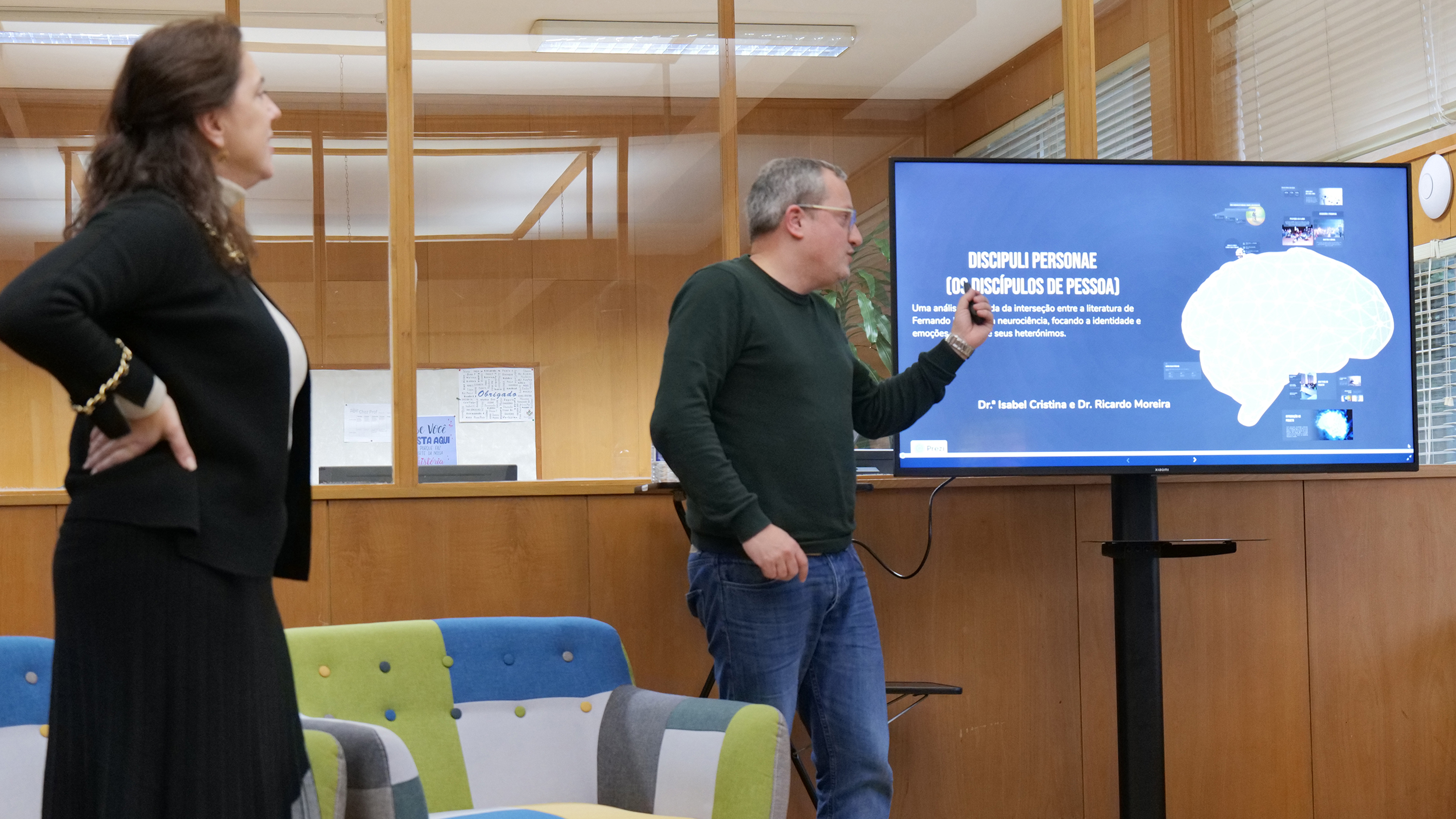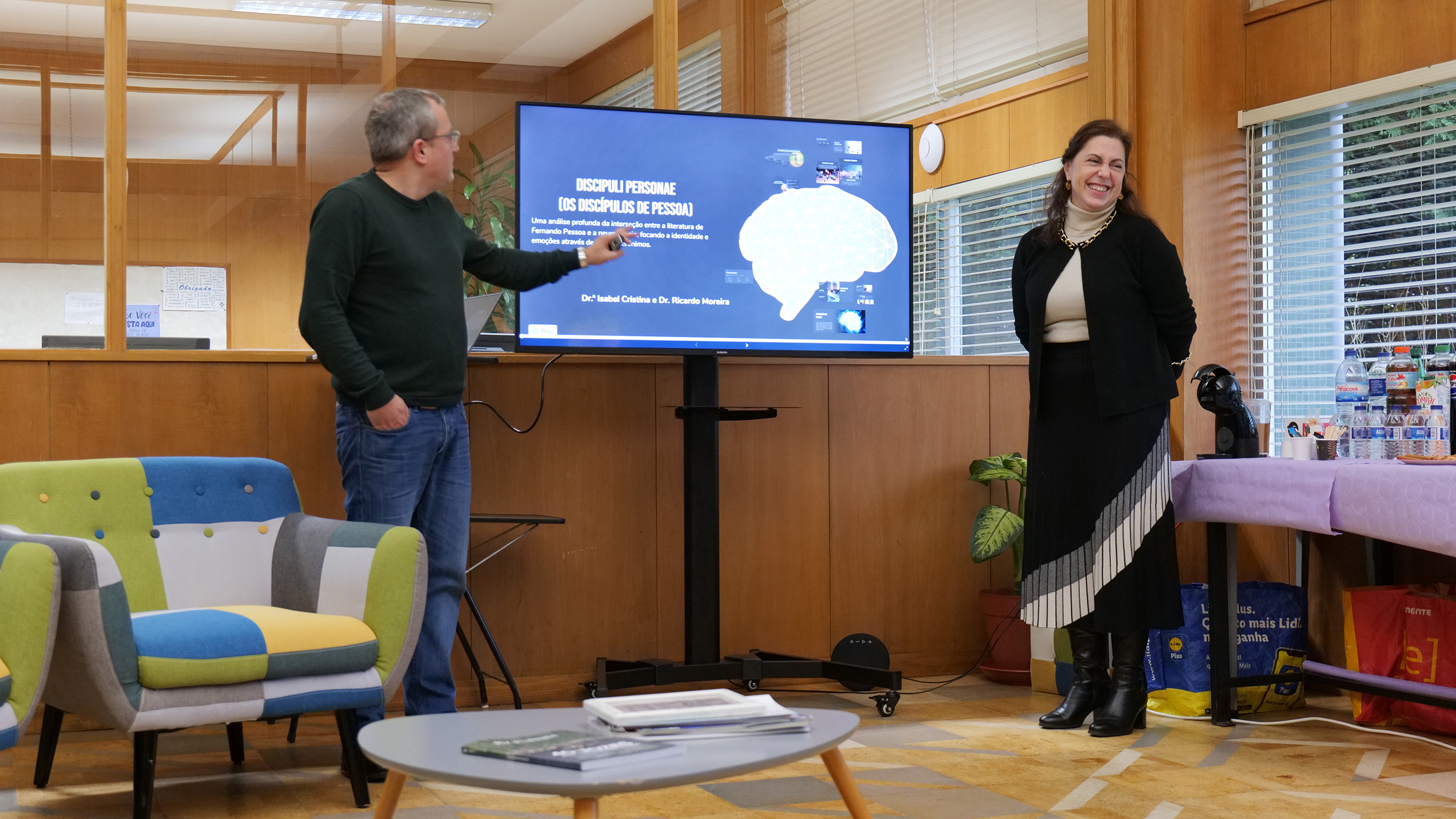 Para complementar esta apresentação, duas das equipas tiveram a oportunidade de dar voz aos seus projetos, explicando, pelas suas próprias palavras, os objetivos, aplicações e finalidades pedagógicas. A primeira equipa a intervir foi a “Discipuli Personae” ("Discípulos de Pessoa"), constituída pela professora Isabel Cristina e pelo professor Ricardo Moreira. Combinando as áreas da Biologia e do Português, os docentes apresentaram o projeto “Da mente para a escrita”, centrado numa abordagem humanista e científica da figura de Fernando Pessoa. A apresentação suscitou interesse e debate, culminando num breve momento de questões por parte dos docentes presentes.