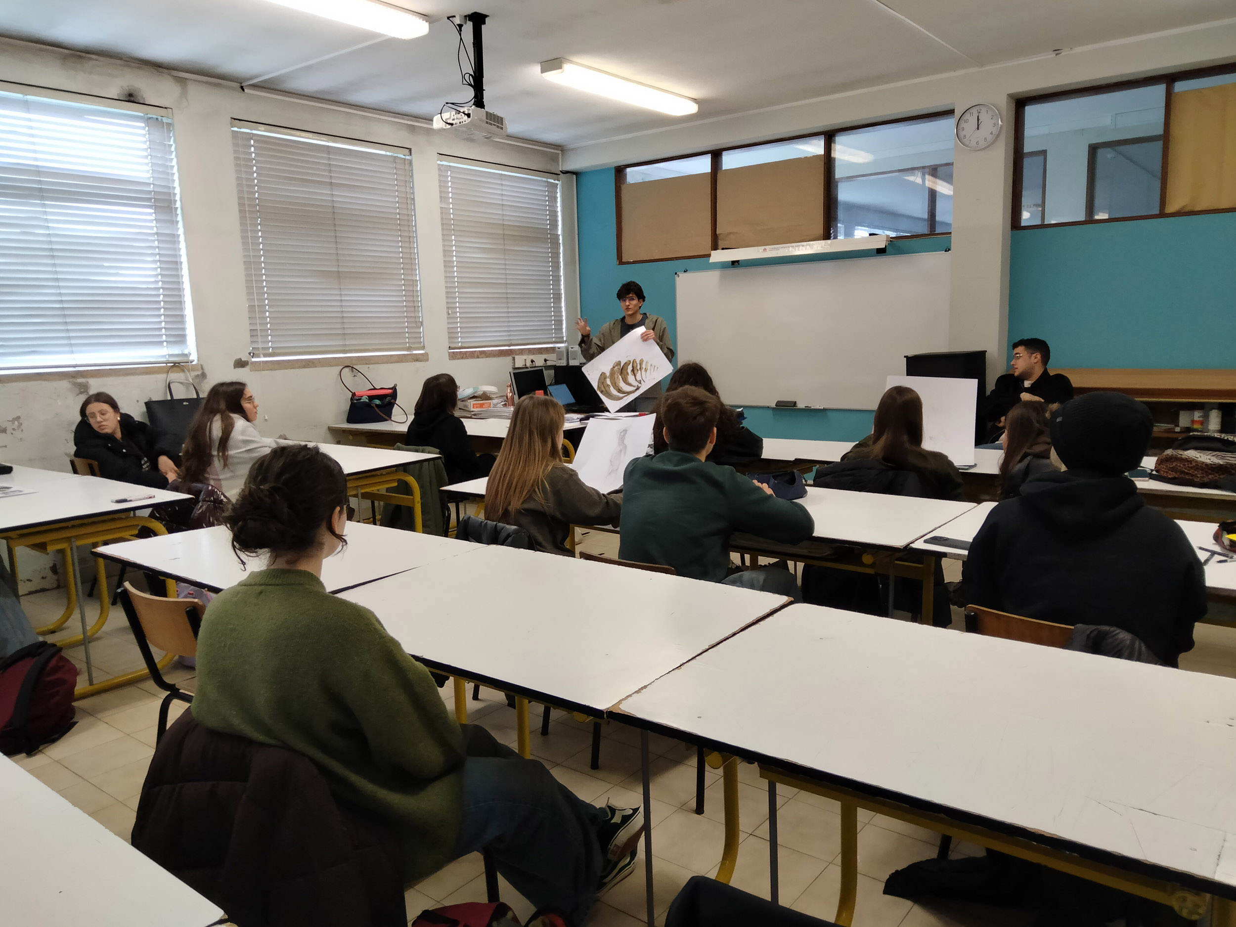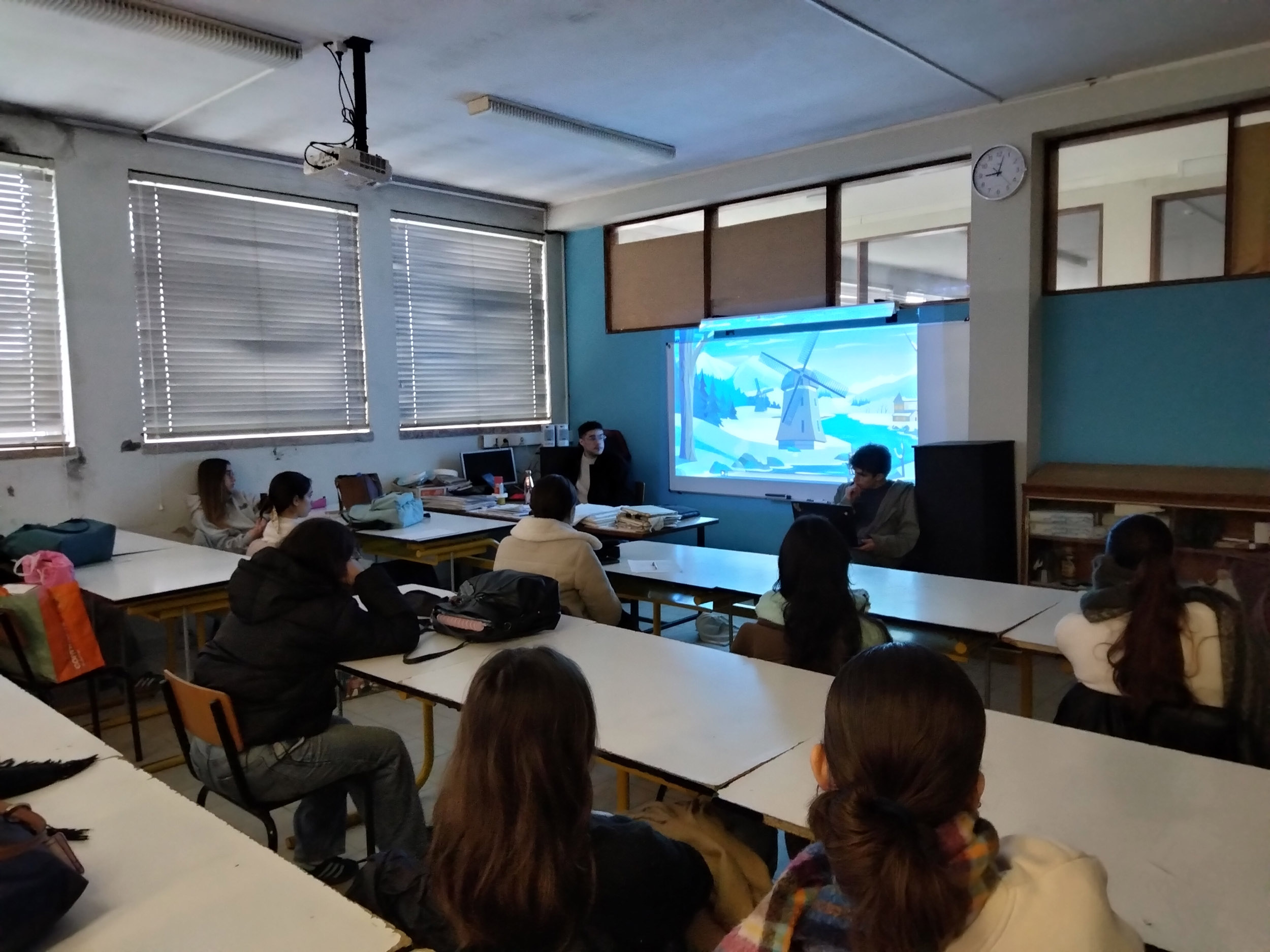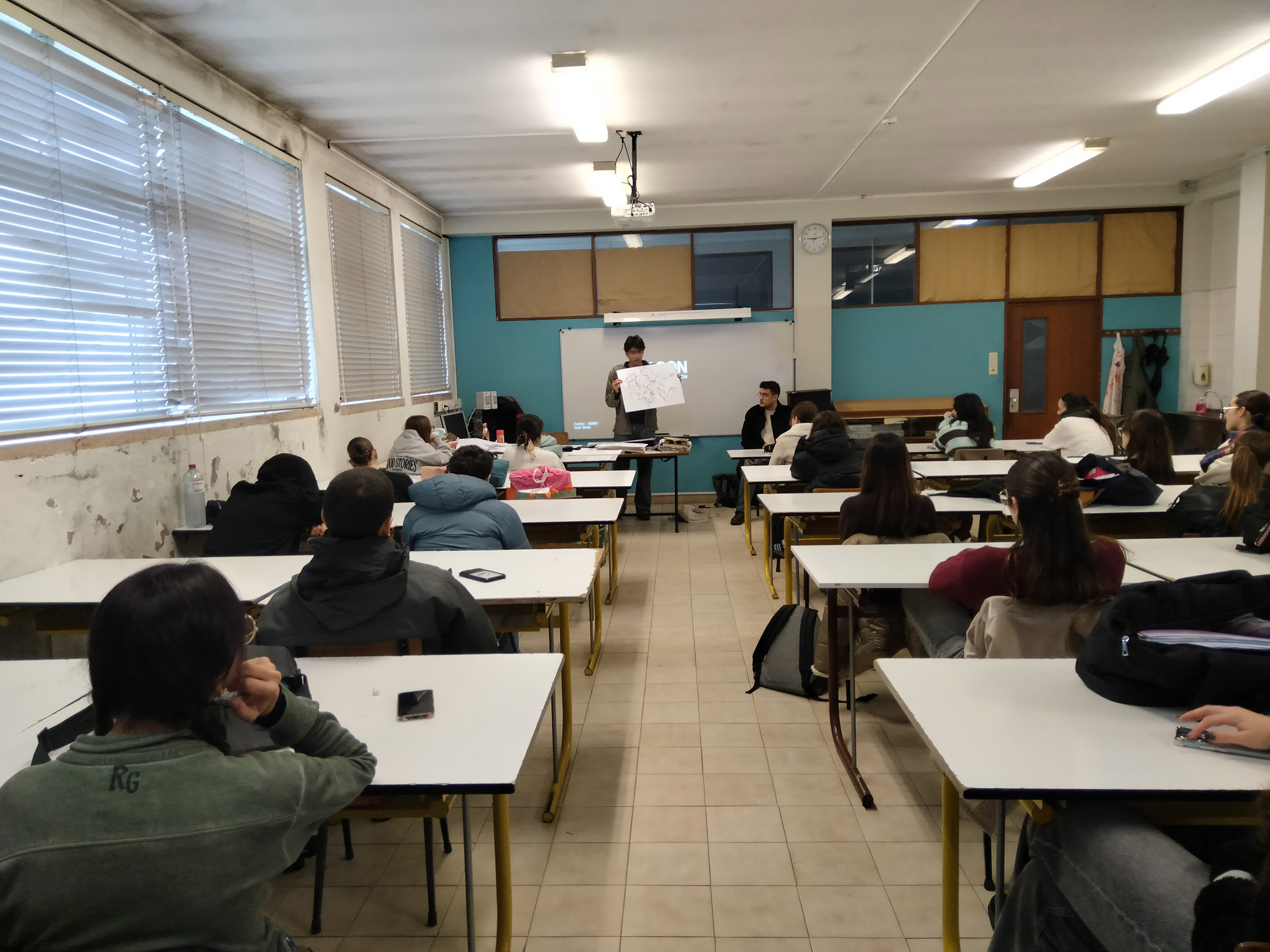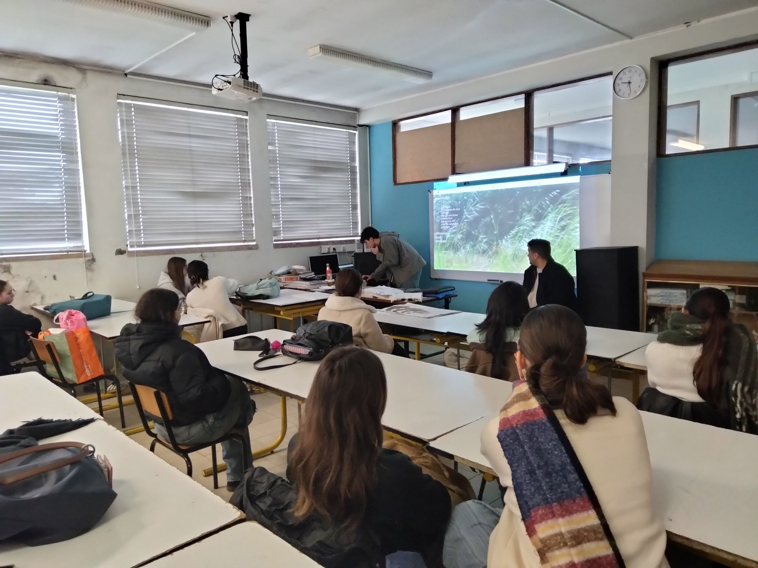 «No passado dia 4 de fevereiro de 2026, os ex-alunos João Silva e Miguel Ferreira, do Curso de Artes e Indústrias Gráficas, realizaram uma visita à sua antiga “casa”. Na turma AG do 12.º ano, na disciplina de Introdução às Teorias do “Design”, João e Miguel partilharam a sua experiência neste curso e seguiram, mais tarde, o ensino superior. João está já a trabalhar no Porto Canal e Miguel encontra-se no primeiro ano do Mestrado em Ensino de Artes Visuais no Instituto de Educação da Universidade de Lisboa.