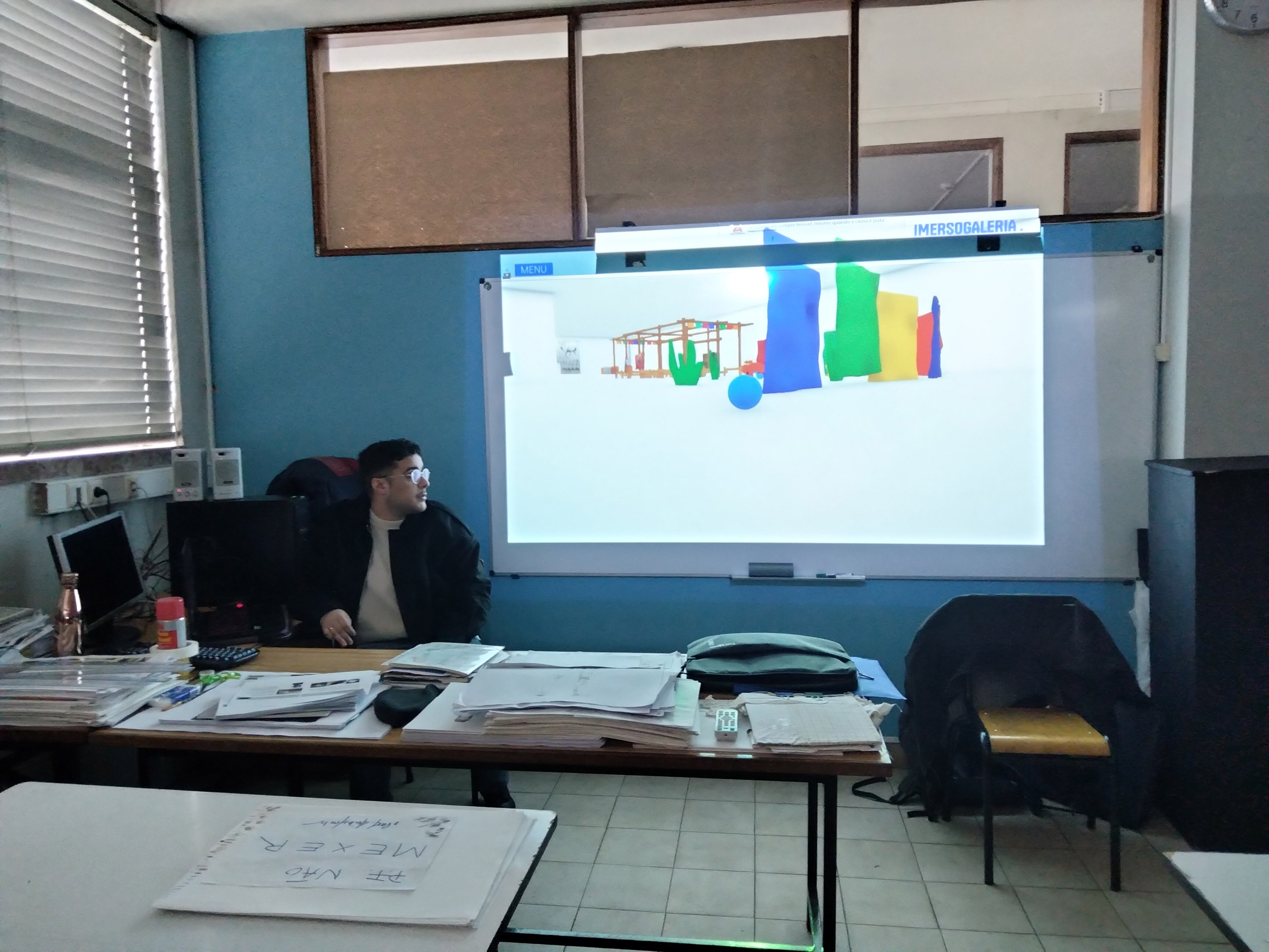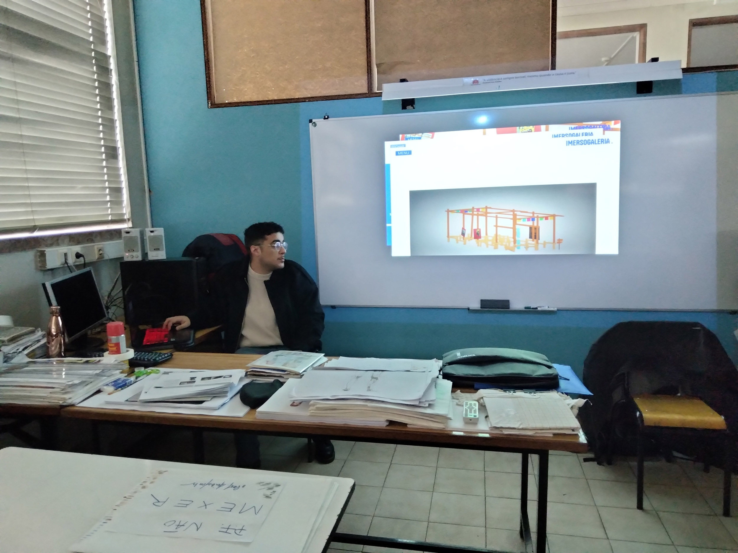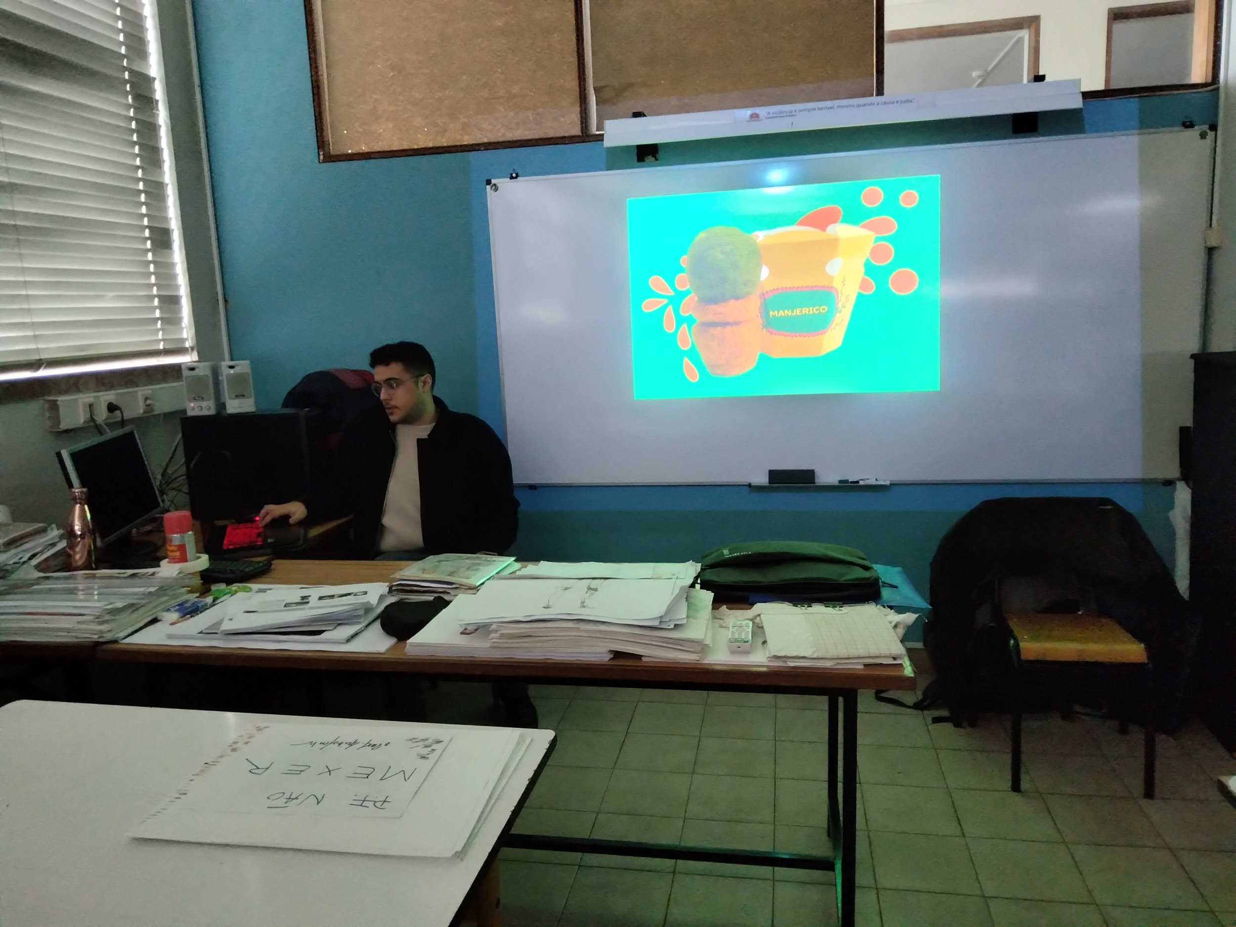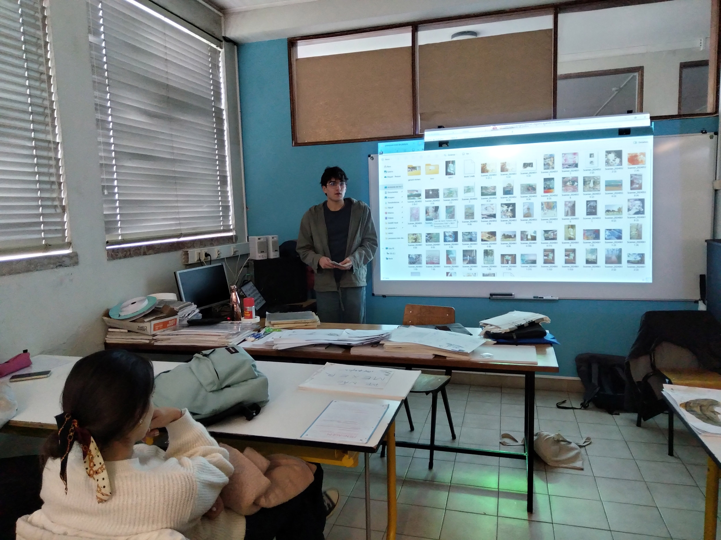 Já Miguel licenciou-se na FBAUP em Multimédia e está no início do seu mestrado. Tal como João, também mostrou os seus trabalhos feitos ao longo do curso, permitindo que os alunos pegassem nesses trabalhos e os vissem com mais detalhe e atenção. Explicou todo o seu percurso pela Universidade e referiu a união entre os alunos que se ajudam uns aos outros, já que a FBAUP tem poucos recursos. Além disso, mencionou a liberdade nos projetos, isto é, mesmo com restrições e temas pedidos, podia explorar além do tema e não seguir os limites à risca. Miguel, também, aconselhou os alunos a não apagarem ou deitar fora os seus trabalhos, porque é muito importante para ver a nossa evolução.