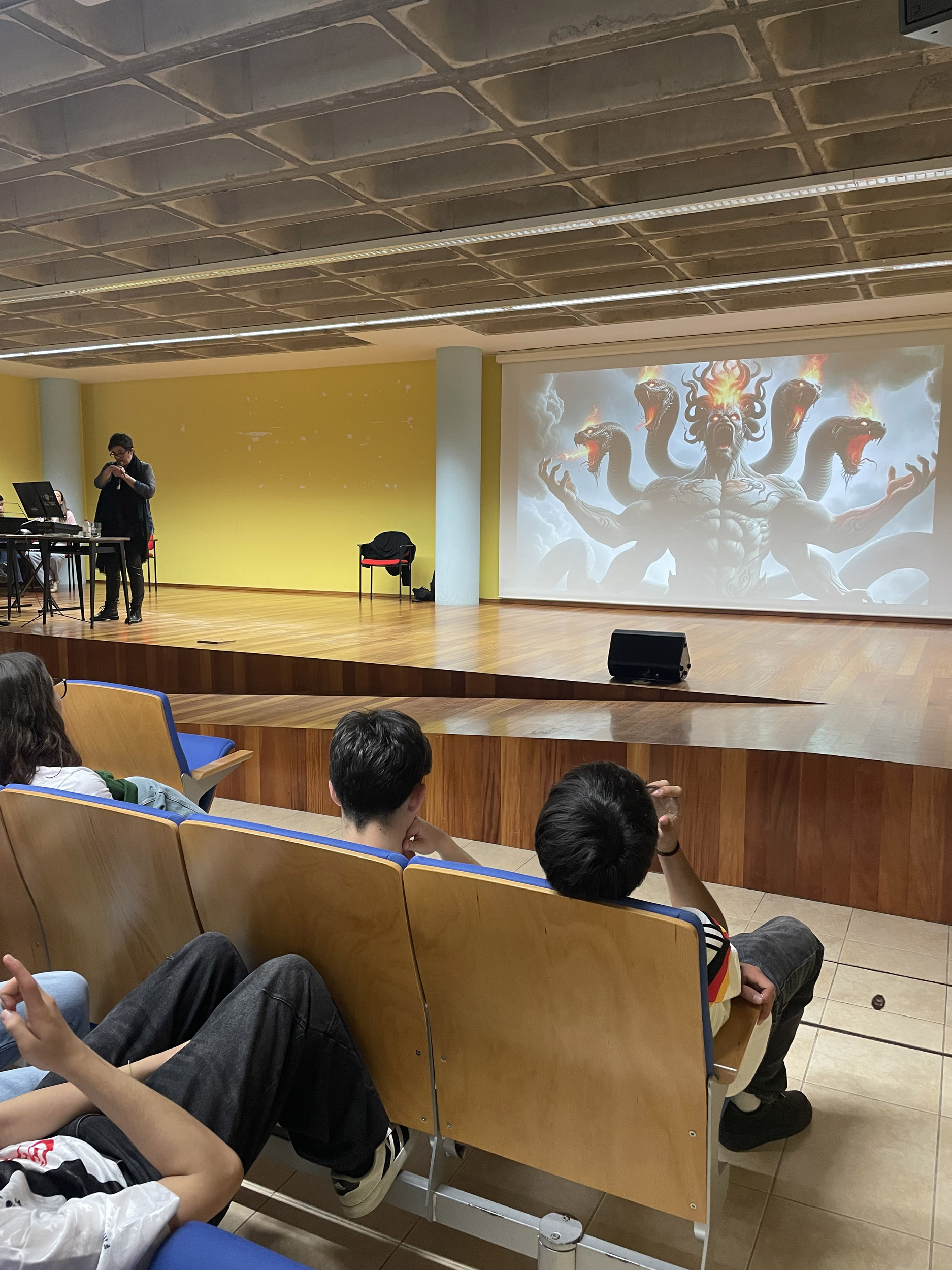 No passado dia 24 de março de 2026, entre as 14h00 e as 16h00, decorreu, no Auditório Claret, uma sessão cultural integrada nas comemorações do Dia Mundial da Poesia e da Semana da Leitura, no âmbito da Semana Cultural/ExpoCIC 26. A atividade reuniu alunos de várias turmas e professores convidados, promovendo o encontro entre a música, a literatura e o universo da mitologia.