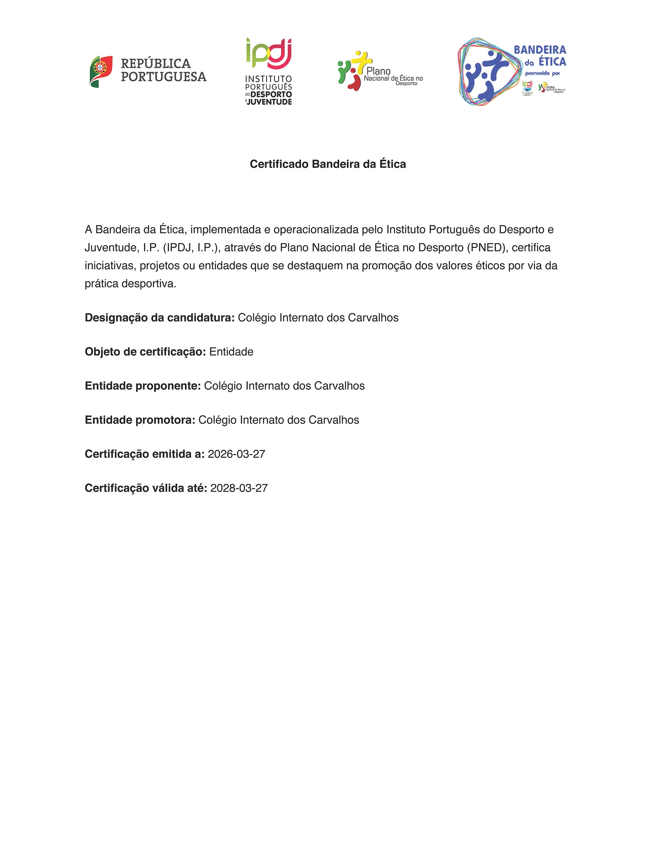 A certificação, válida por dois anos, foi atribuída à Entidade Colégio Internato dos Carvalhos por se destacar na promoção dos valores éticos por via da prática desportiva. É, pois, longa a história do desporto no CIC, quer ao nível federado quer no desporto escolar, revestindo-se como uma verdadeira escola de formação desportiva, ao nível de atletas, treinadores e dirigentes. O CIC competiu em vários desportos federados - andebol, voleibol, basquetebol, ginástica, ténis, râguebi, judo e “taekwondo”. São vários os atletas que, ao longo dos tempos, representaram as respetivas seleções nacionais.