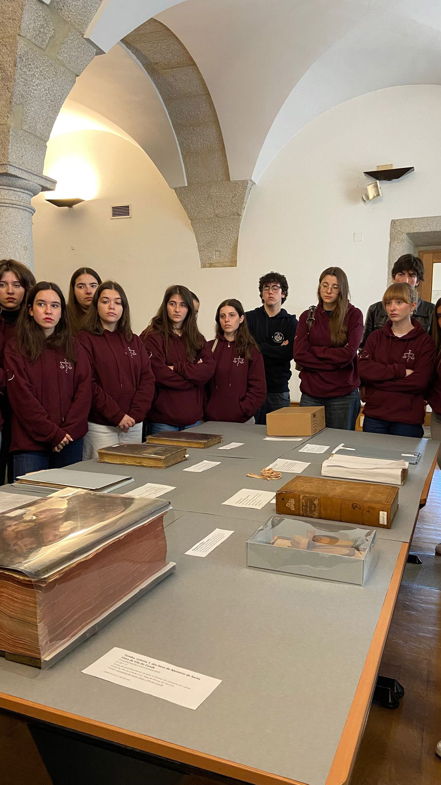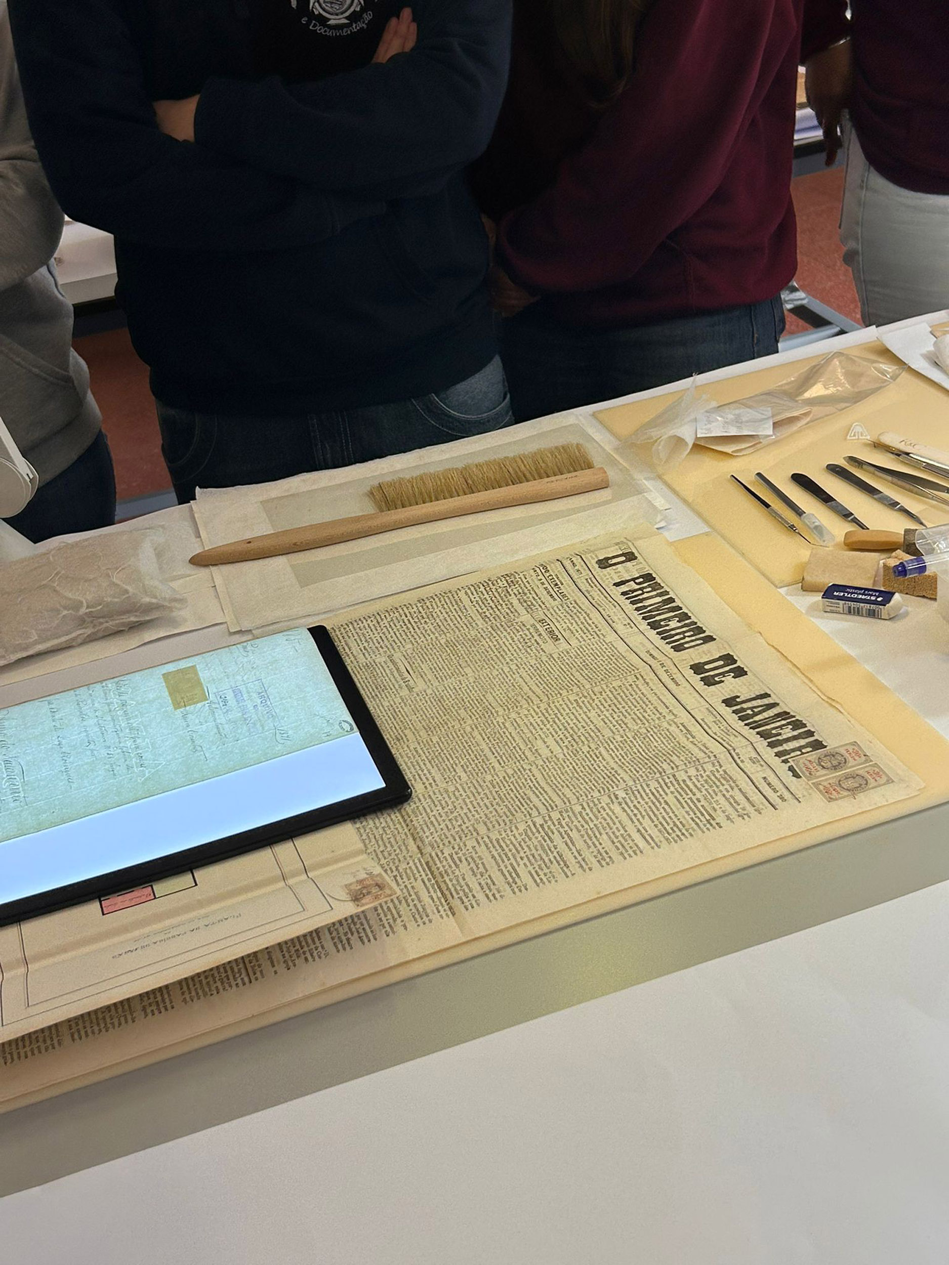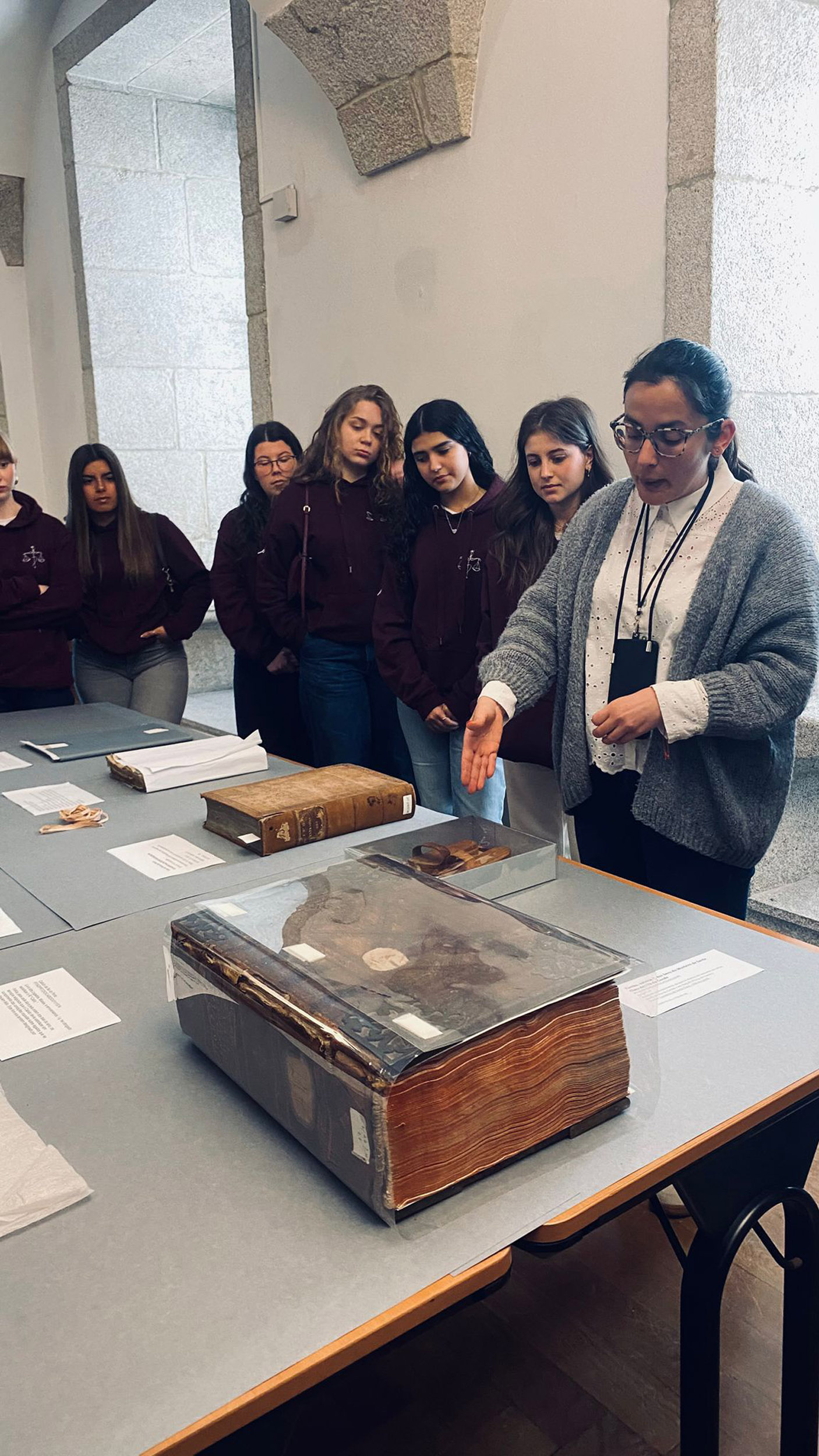 De manhã, a aula destinava-se a consolidar conhecimentos da componente documental do curso tendo ocorrido no espaço do Arquivo Distrital do Porto, instalado no edifício histórico recuperado do Mosteiro de São Bento da Vitória, onde foi possível conhecer as áreas técnicas, os depósitos e as salas de leitura que o compõem. Visitar o Arquivo Distrital do Porto (ADP) é importante porque permite compreender, de forma direta e documentada, a história, a identidade e a memória coletiva do distrito do Porto. 12 km de documentação de conservação permanente, alocada em 10 depósitos, reúnem registos civis, paroquiais, judiciais, administrativos e privados que testemunham séculos de história da região e que são fundamentais para compreender a evolução social, cultural e política do território. Guiados pela Dr.ª Ana Clarinda, ex-sempre aluna do CIC e pela Dr.ª Ana, os alunos observaram processos (estudados em aula) de conservação, restauro e digitalização, essenciais para garantir que estes materiais sobrevivam para as gerações futuras, desmistificando a ideia de que os arquivos são depósitos, apenas de papéis, velhos. Com efeito, foi possível perceber que existem vários suportes documentais em 990 fundos documentais, e que o acesso online é uma preocupação desta instituição para melhor servir estudantes e investigadores, genealogistas, profissionais de história, património e direito e cidadãos que procuram certidões ou documentos antigos através de serviço presencial ou remoto.